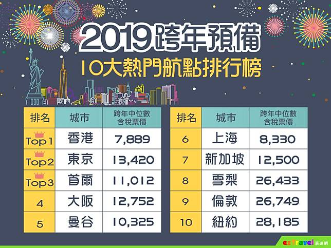 十大熱門航點由香港位居第一,國人出國跨年仍以鄰近的短程國家居多,主要考量的還是票價相對便宜。亞洲地區的機票含稅價大多落在1萬初,又以香港最便宜,含稅價不到8千左右就可以出發,加上維多利亞港的跨年煙火秀,也是全球矚目焦點之一,讓香港成為今年跨年的熱門首選。